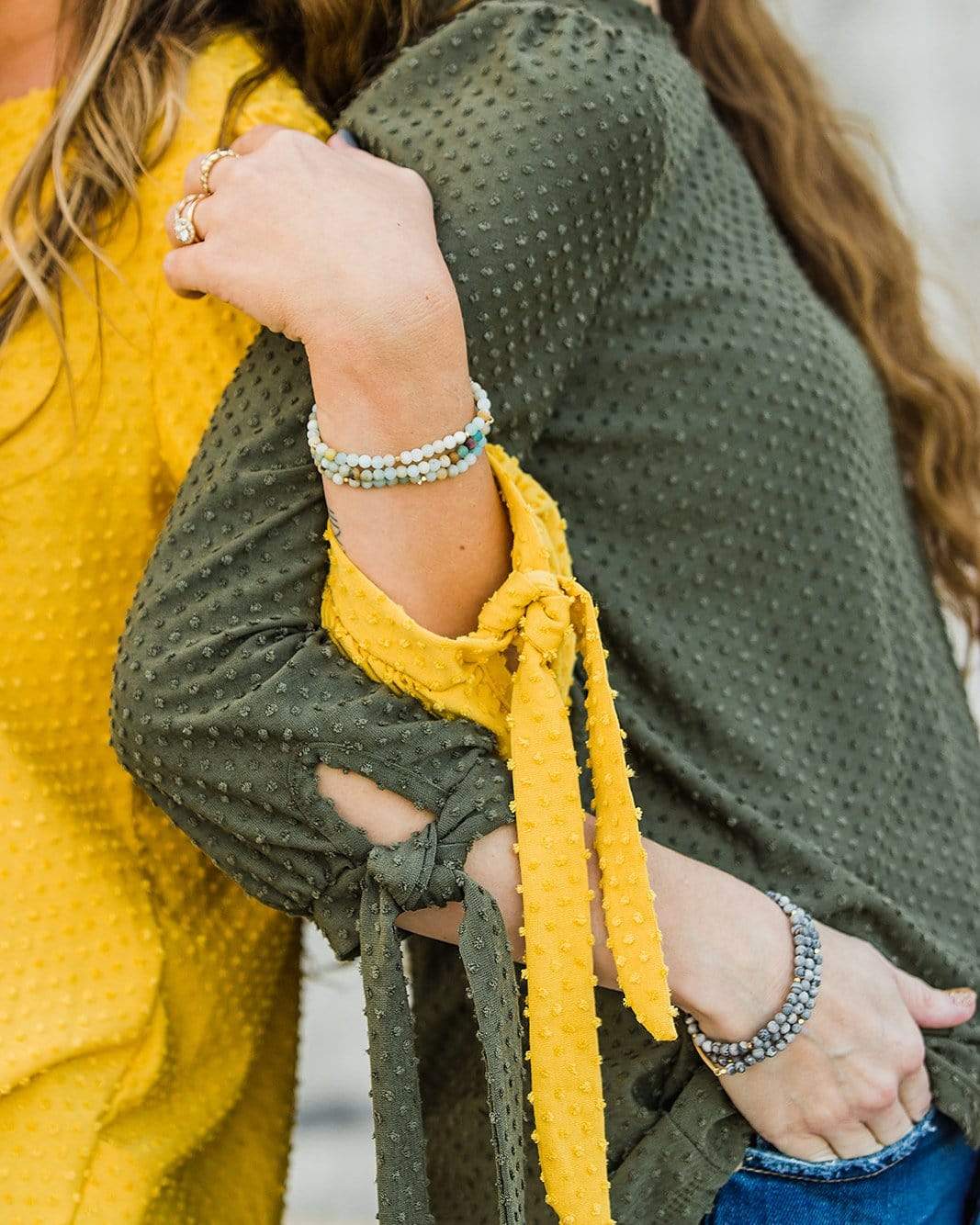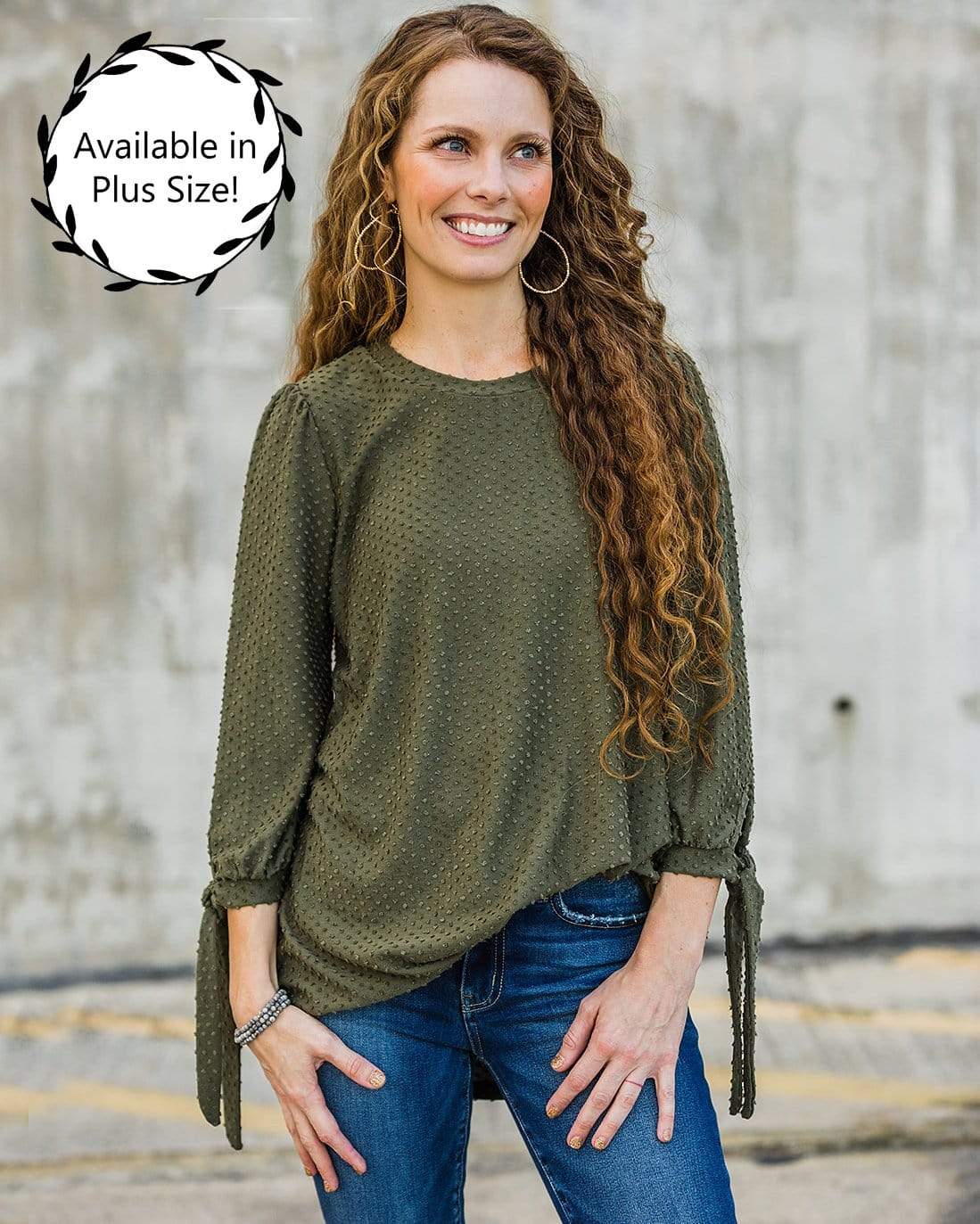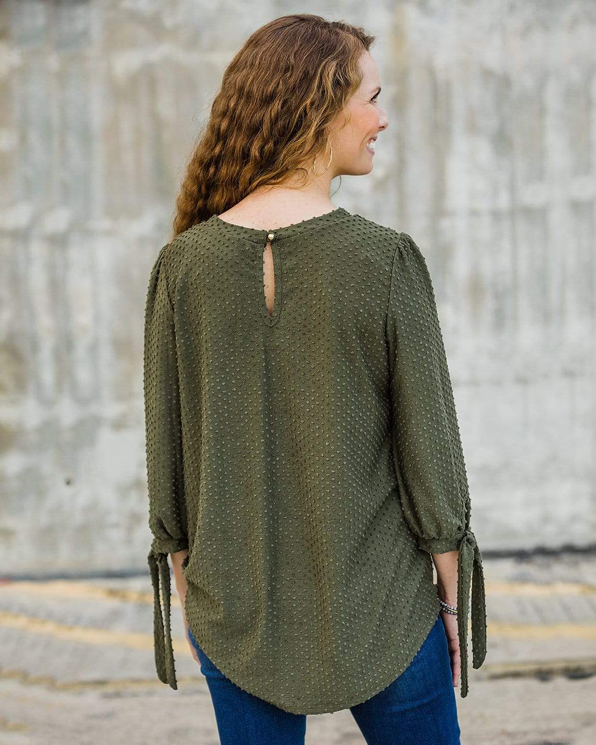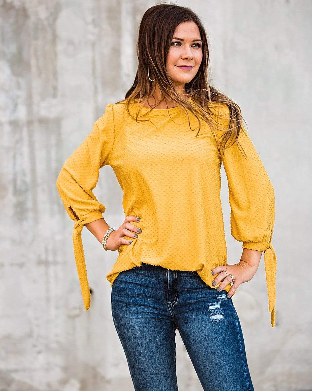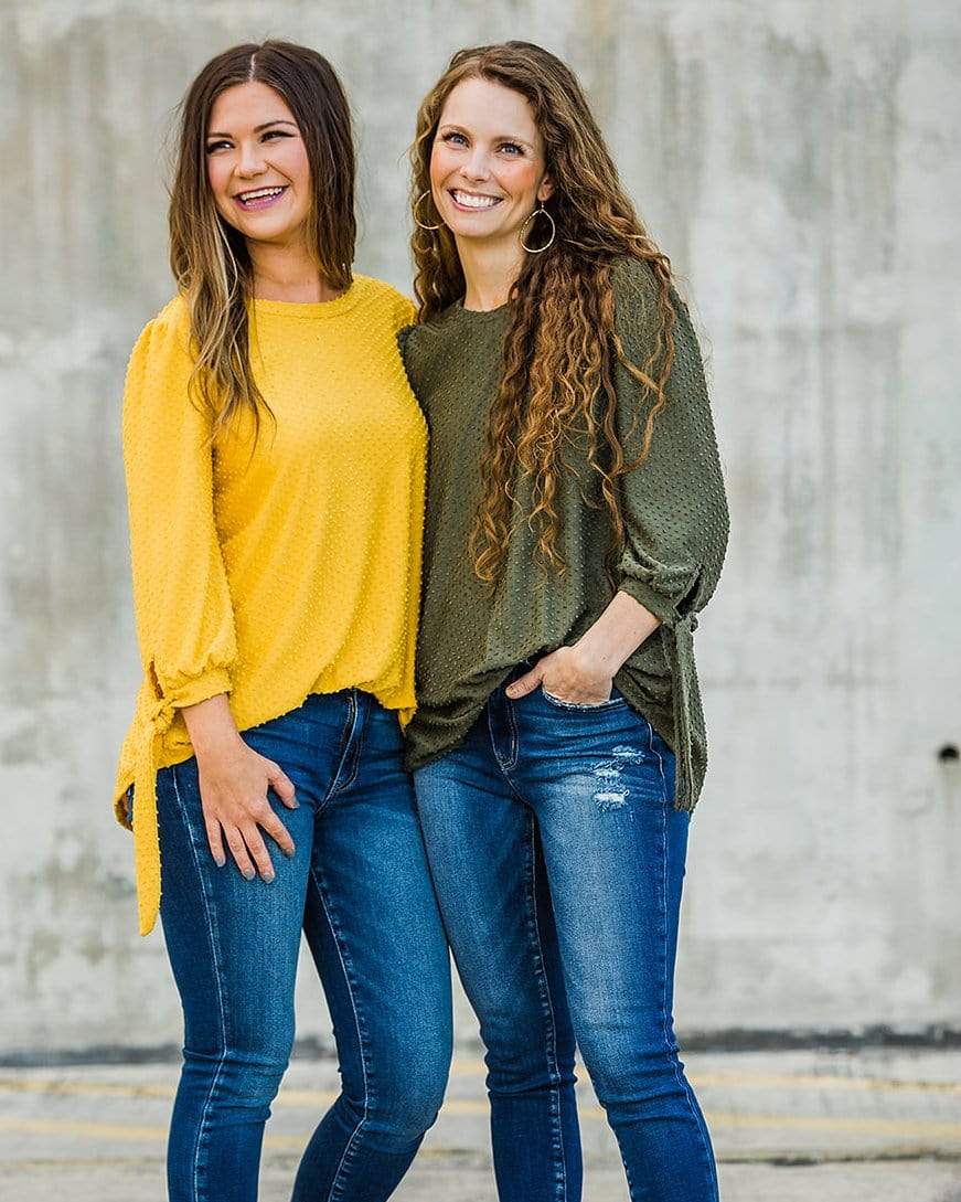 A classic top that you will reach for time and time again. We love the textured dots, tie cuff sleeves and round hemline.